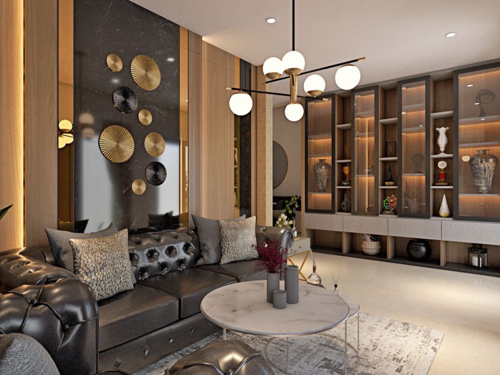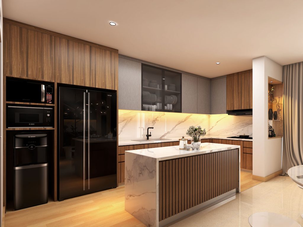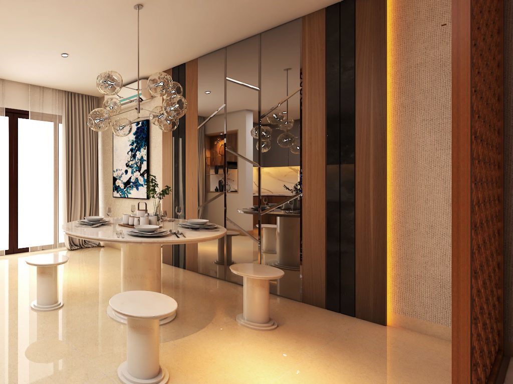 Interior rumah yang didesign dengan kesan mewah dan hangat. Dengan material utama dapur quadra putih motif staturio dan HPL motif kayu, cermin bronze dan LED strip indirect light sebagai aksen. Juga partisi dengan motif cnc cutting sebagai pembatas ruang makan.