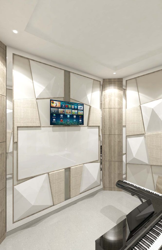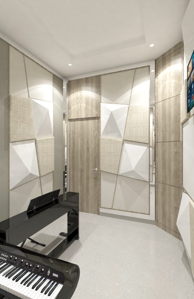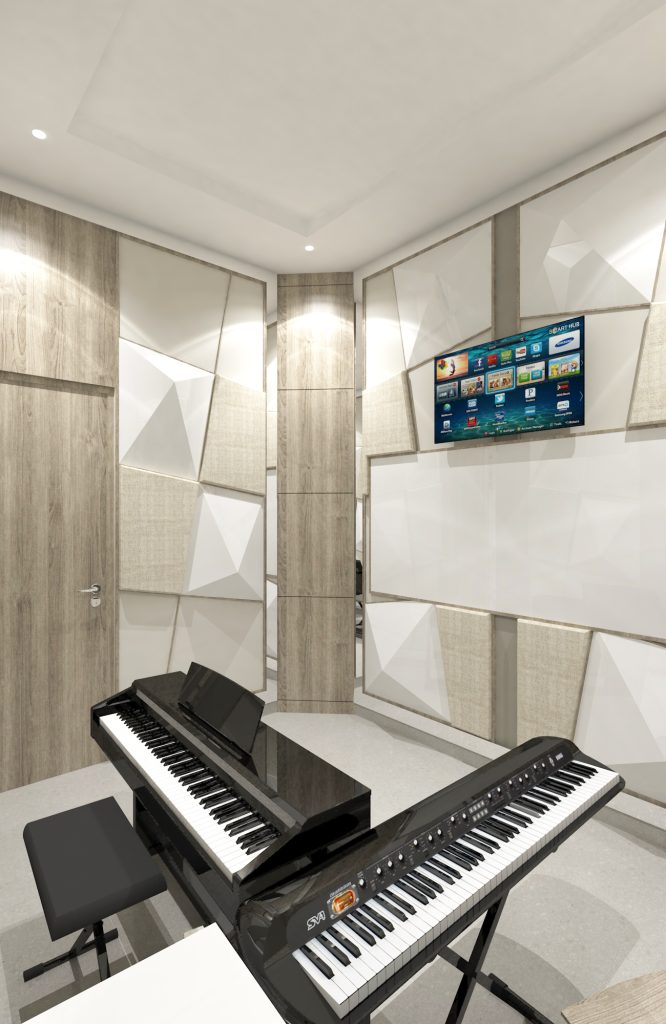 Design ruang ini adalah salah satu studio mini dalam sekolah musik, yang dirancang untuk kegiatan belajar alat musik tertentu. Ruangan dirancang dengan sound proof yang maksimal baik di dinding, plafond, maupun pintu, untuk mendukung kegiatan belajar musik dengan optimal.